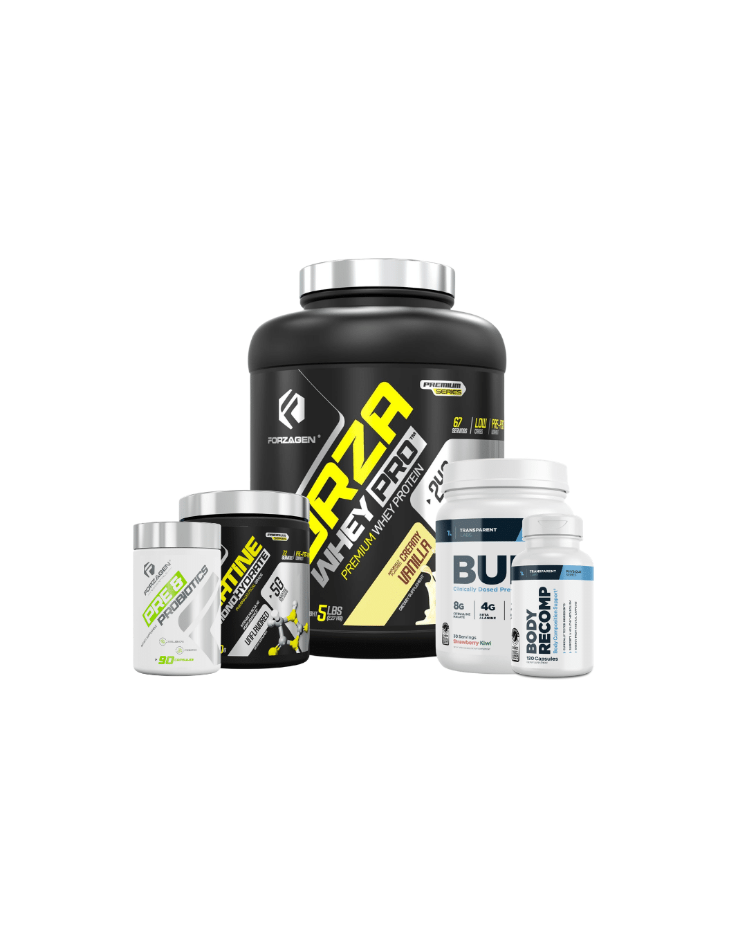 Incluye: Forza Whey Pro 5 lb, Recomp Fat Burner -120 caps, Pre-Entreno Bulk- 30serv, Creatina Monohidratada 72 serv y Probioticos 90 caps.